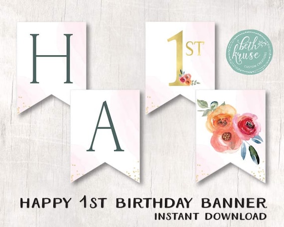 Happy 1st Birthday Banner Floral Banner Blush And Gold Printable Banner Click On Item Details Pdf By Beth Kruse Custom Creations Catch My Party